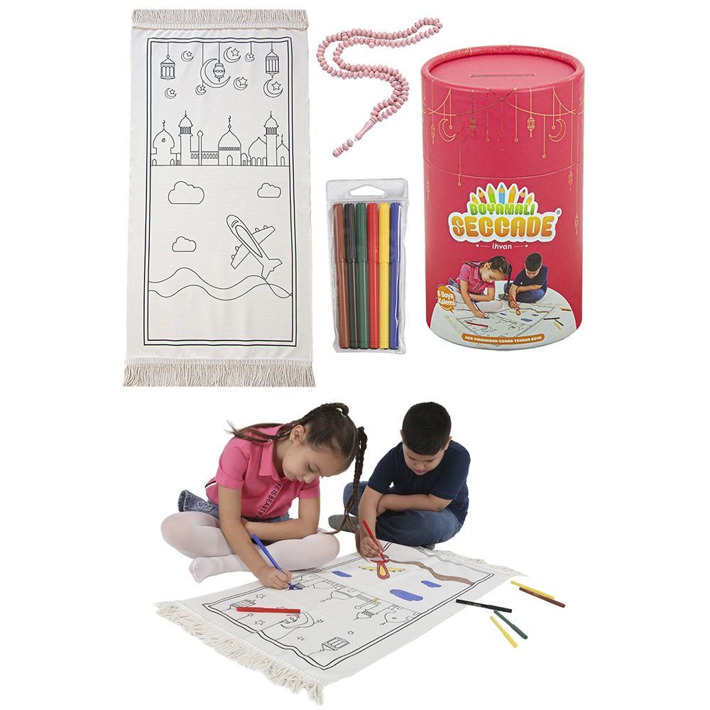 RS32-Boyamalı Yıkanabilir Çocuk Seccade Seti Silindir Kutu